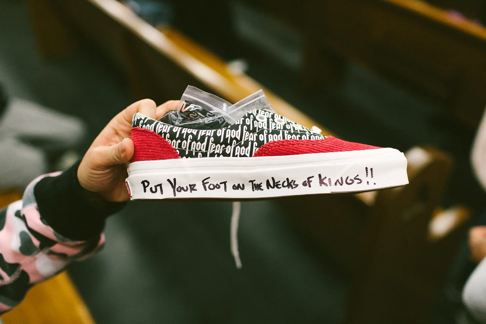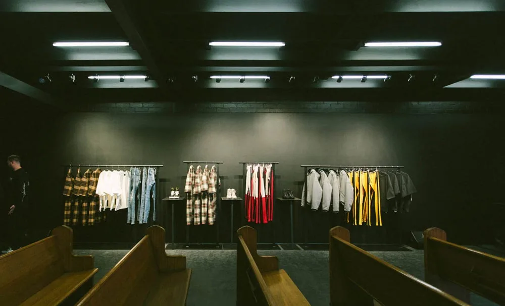 At the heart of Melrose Avenue, the Maxfield Gallery was transformed into the "House of God," where fashion met innovative design. The centerpiece was an oversized LED screen, a striking installation that played a continuous loop of vintage content, original Fear of God visuals, and curated moments of reflection. Wooden pews were strategically placed throughout the space, inviting visitors to engage with the environment in a way that felt both intimate and powerful.